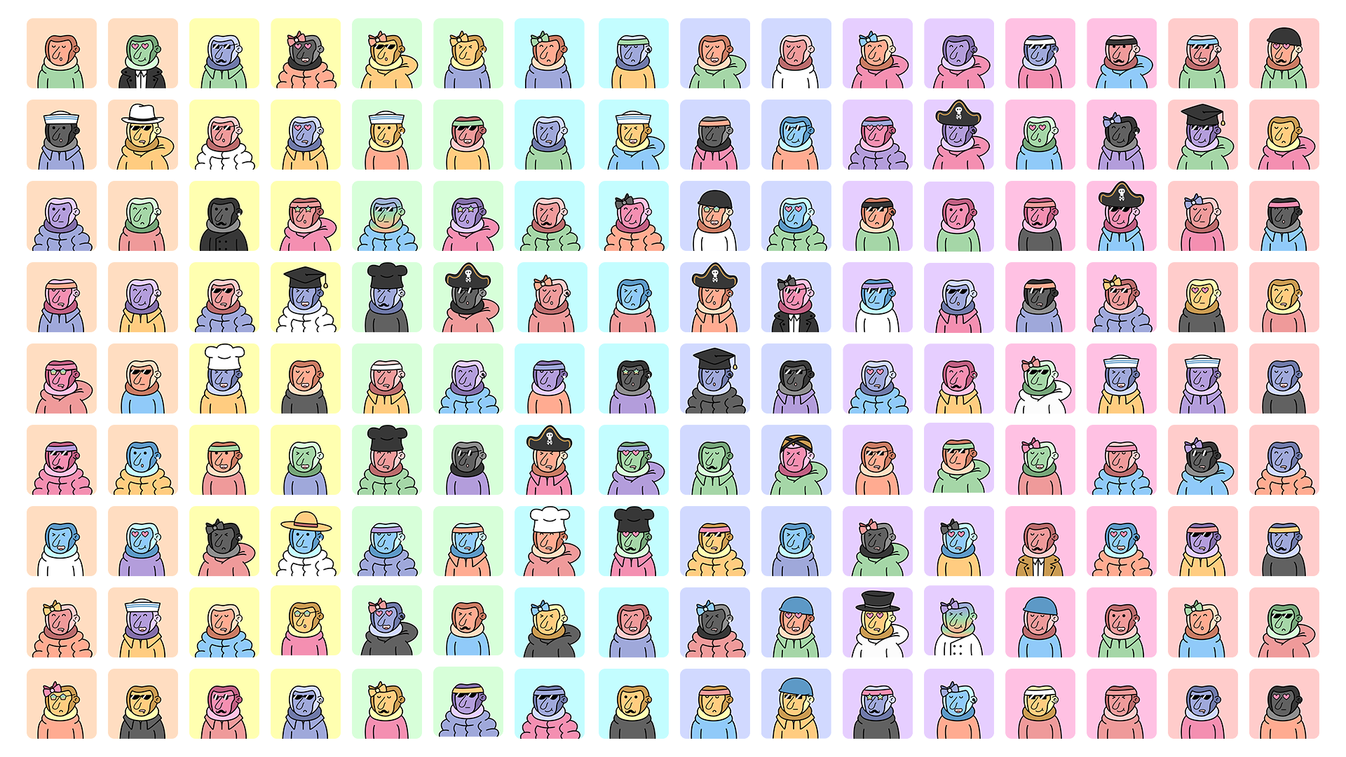 Each MetaBekantan has been constructed algorithmically by a special script that basically mixes a variety of hand-drawn properties with different possibilities in the following categories: Background, Clothes, Head, Headwear, Eyes, Mouth, Accessory.